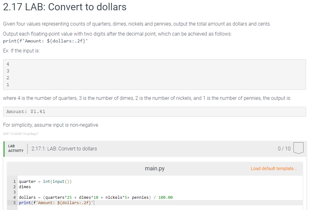 Solved 2.17 LAB Convert to dollars Given four values Convert Dollar Amount To Decimal Web this converter takes the number you type in and spells it out in words (with letters), so you can learn how to write out currency. For example, 8 dollars 25 cents = $ 8.25. Web dollars and cents can be expressed together as decimals. For example, you know that $0.50 is half of. Web rounding calculator to round numbers. Convert Dollar Amount To Decimal.